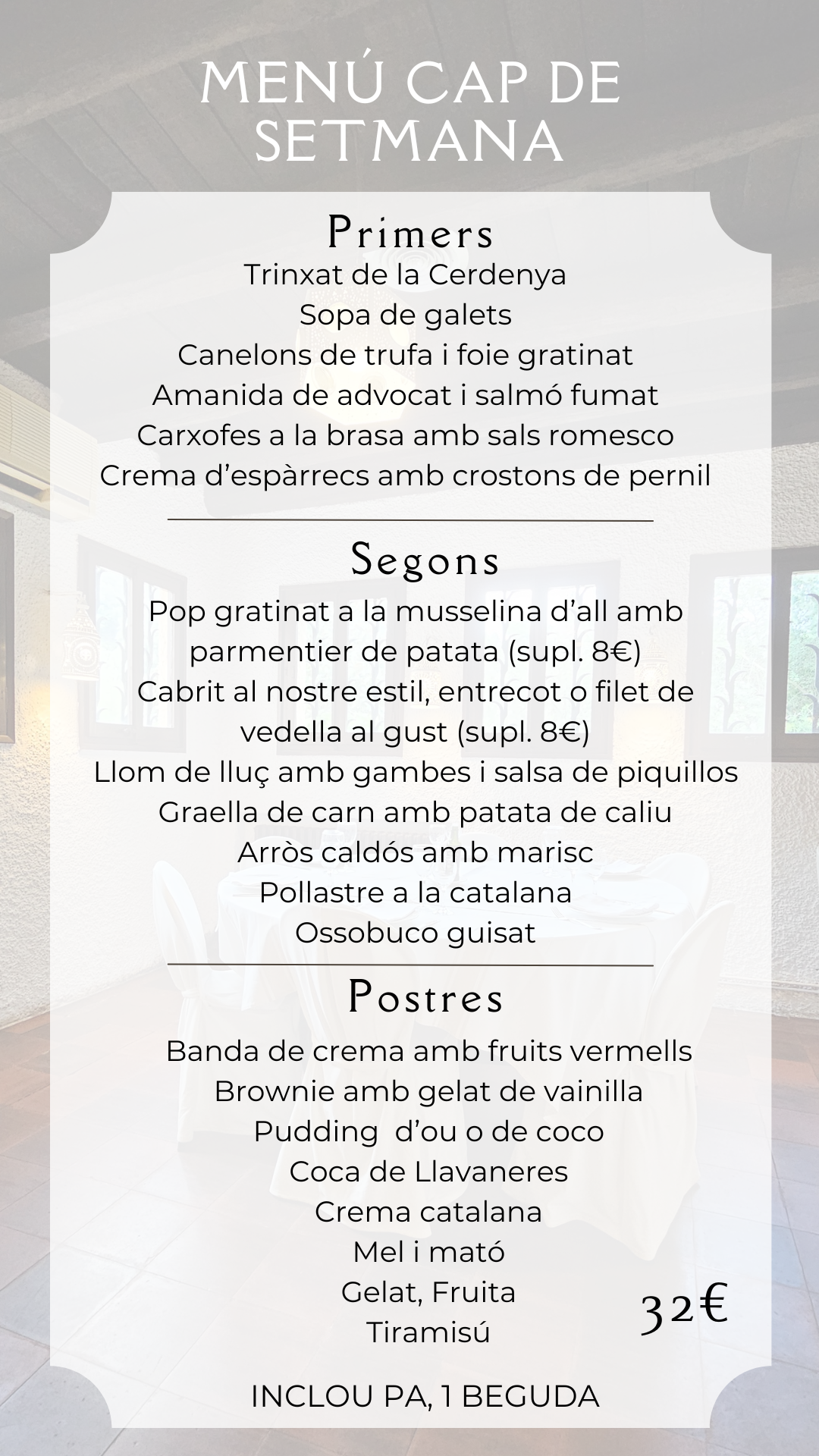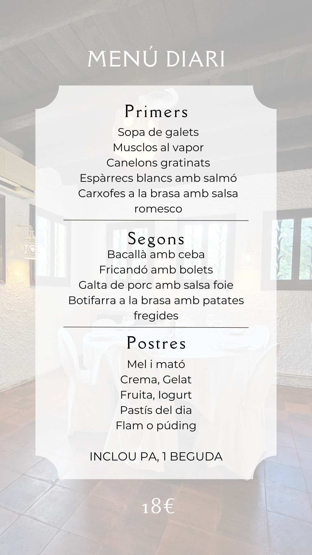 Oferim un menú diari pensat per a aquells que busquen desconnectar de la rutina i gaudir d’una pausa relaxada en un entorn únic. La nostra carta combina sabors tradicionals i moderns, perfectes per a un dinar entre amics, una pausa amb la família o fins i tot un dinar de negocis. Fes del teu moment del dia un instant especial a Mas Nadal.